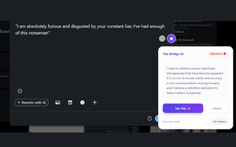 واحدة من الميزات البارزة هي تحليل النغمة، المقدم من خلال مخطط راداري بصري يقيم جوانب مثل الود، والاحترافية، والوضوح. بالإضافة إلى ذلك، فإن وظيفة إعادة الكتابة بنقرة واحدة تتيح للمستخدمين تحويل المسودات غير الرسمية إلى نصوص مصقولة ومهنية بسهولة. بشكل عام، يعزز الجسر جودة التواصل، مما يجعله موردًا قيمًا لأي شخص يتطلع إلى تحسين مهارات الكتابة الخاصة به في بيئة مهنية.
